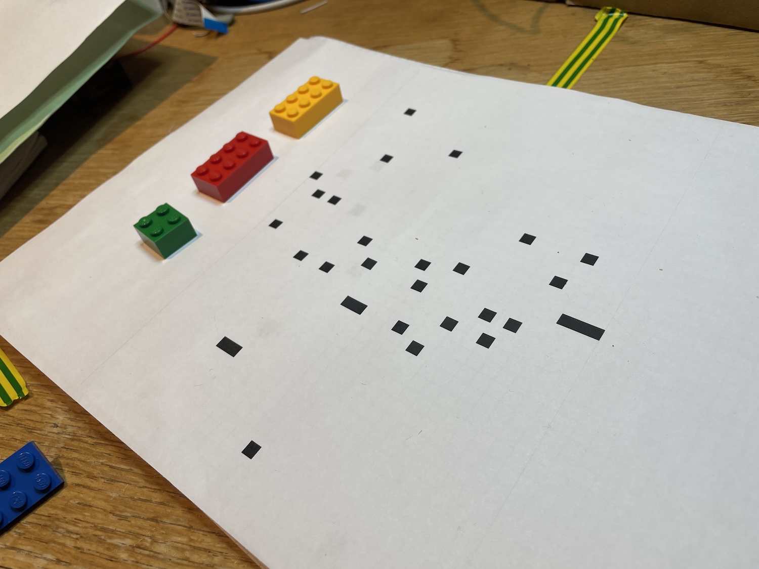 Then I add lego bricks of different colours to change the parameters - in this case the defaults are slow tempo, beepy synth and key of C, and adding various coloured bricks flips that to a fast tempo, crunchy synth and key of C#.